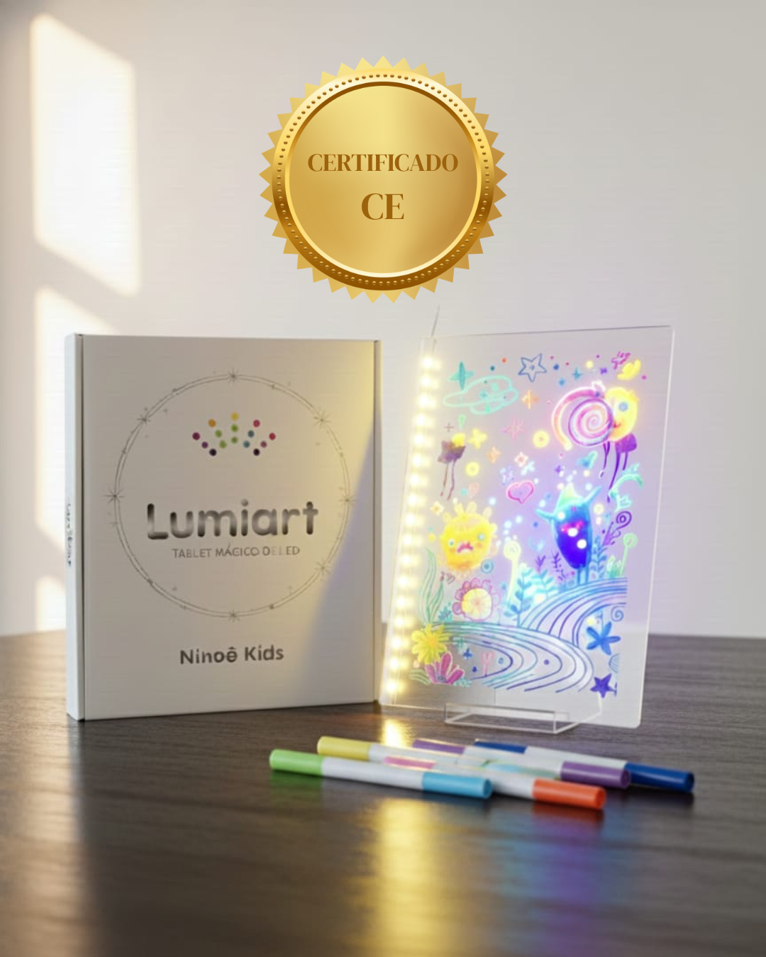 O Lumiart é recomendado para crianças a partir de 3 anos. A placa tem bordas arredondadas, luz suave e fria (não esquenta) e é feita em material rígido, sem vidro. Como qualquer produto com cabo e canetas, indicamos sempre uso com supervisão de um adulto.